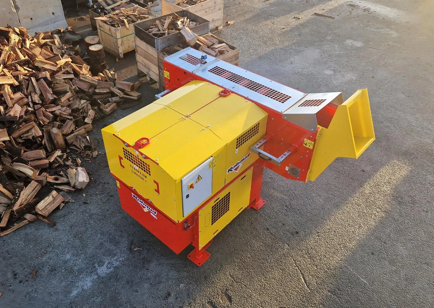 The XYLOFLAM 330/450+ can produce Kindling or Logs. This machine is for all wood types. It can take three lengths of wood: 200, 250, or 330mm, with a maximum diameter of 450mm. The crossed splitter produces 16 tons of power, and the kindling/log section is adjustable from 20mm to 150mm.