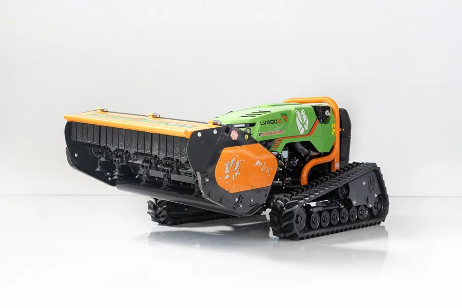 At the front, a latch can be opened using the remote control. Opening the latch allows for shredding vertical branches and small trees and shrubs while closing the latch enables finely mulching the debris on the ground.​