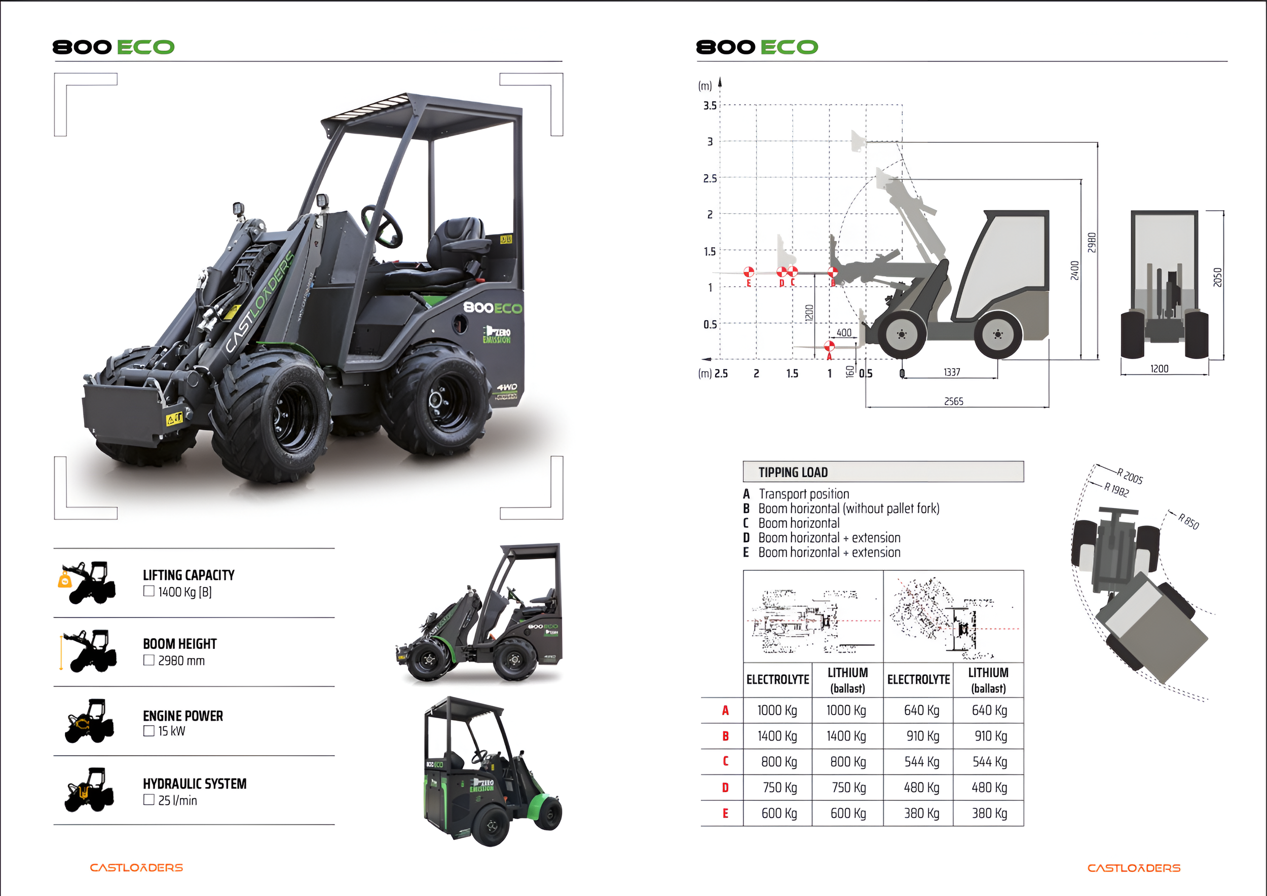 The 800 Eco is an all-electric model featuring a 20Hp engine and a 1400 Kg lifting capacity. The driving position located above the rear wheels allows greater control of the vehicle. In addition, the silent block system that lifts the cab from the chassis allows the operator to avoid violent shocks and vibrations.